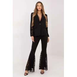 Elegantní dámské zvonové kalhoty jsou stylovým návrhem určeným pro návštěvy a večerní události, kde se počítá s elegancí, moderním střihem a ženským charakterem. Model vyrobený z polyesteru, viskózy a elastanu poskytuje pohodlí, pružnost a ideální přizpůsobení postavě, zatímco si udržuje elegantní vzhled. Hladký dominantní vzor zajišťuje minimalistický a nadčasový vzhled kalhot. Střih s vysokým pasem krásně zdůrazňuje pas, zatímco široké zvonové nohavice prodlužují nohy a dodávají celku efektní, ženský charakter. Model nemá zapínání a skvěle se přizpůsobuje postavě, zajišťující vysoký komfort nošení. Pro lehký, decentní dekorativní prvek byly po stranách na spodní části nohavic umístěny krajkové vložky, které kalhotám dodávají eleganci a jedinečné dokončení. Model nemá kapsy, což umocňuje jejich hladký, návštěvní charakter. Jsou to ideální kalhoty pro ženy, které chtějí vypadat stylově, s elegancí a ž