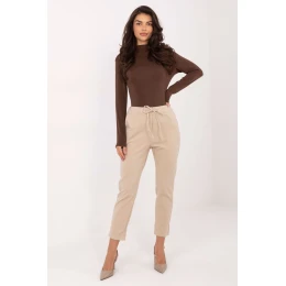 Dámske nohavice z materiálu v ležérnom štýle sú pohodlnou a všestrannou voľbou na každý deň. Sú vyrobené z vysokokvalitnej zmesi bavlny, elastanu a nylonu a poskytujú pohodlie pri nosení, pružnosť a odolnosť. Hladký materiál im dodáva nadčasový charakter, ktorý možno ľahko kombinovať s rôznymi štýlmi. Model s vysokým pásom krásne zvýrazňuje pás a poskytuje pohodlné nosenie. Zúžené nohavice s dĺžkou 7/8 dodávajú nohaviciam moderný vzhľad a opticky predlžujú postavu. Šnúrka v páse umožňuje individuálne nastavenie a praktické bočné vrecká zvyšujú funkčnosť. Nohavice sú ideálne na každodenné nosenie, či už s blúzkou, svetrom alebo športovou mikinou.