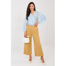 Dámske nohavice so širokými nohavicami v štýle wide leg sú pohodlným a štýlovým návrhom na každý deň a do práce. Sú vyrobené z kvalitnej bavlny s prídavkom elastanu, čo zaručuje pohodlie pri nosení, pružnosť a dobré prispôsobenie. Hladký vzorovaný model s vysokým pásom krásne zvýrazňuje pás a v páse je vložená elastická guma pre pohodlie a voľnosť pohybu. Široké nohavice s efektným volánovým zakončením dodávajú nohaviciam moderný a trendový charakter. Nohavice nemajú zapínanie, čo ešte viac zvyšuje pohodlie pri používaní. Praktické bočné vrecká zvyšujú funkčnosť modelu. Ideálne na každodenný styling s košeľou, blúzkou alebo svetrom.