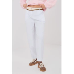 Pohodlné a štýlové nohavice v mrkvovom strihu, ideálne na každodenný, ležérny štýl. Vyrobené z vysokokvalitnej bavlny s prídavkom elastanu, ktorý zaručuje pohodlie a jednoduchosť nosenia a jemnú elasticitu. Nohavice majú vysoký pás a zúžené nohavice sa rozširujú na dĺžku 7/8, čo im dodáva moderný charakter. V páse je elastický pás a nohavice majú aj opasok s možnosťou zapínania, čo umožňuje ideálne prispôsobenie. Praktické bočné vrecká dodávajú funkčnosť a jednofarebný vzor uľahčuje kombinovanie s rôznymi kúskami šatníka. Tieto nohavice sú skvelou voľbou pre tých, ktorí ocenia pohodlie, voľnosť pohybu a moderný ležérny vzhľad.