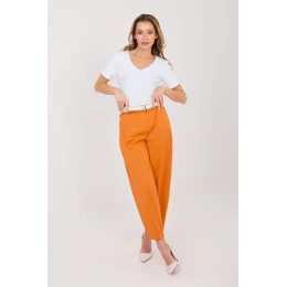 Pohodlné a štýlové nohavice v mrkvovom strihu, ideálne na každodenný, ležérny štýl. Vyrobené z vysokokvalitnej bavlny s prídavkom elastanu, ktorý zaručuje pohodlie a jednoduchosť nosenia a jemnú elasticitu. Nohavice majú vysoký pás, nohavice sú šité a siahajú do dĺžky 7/8, čo im dodáva moderný charakter. V páse je elastický pás a nohavice majú aj opasok s možnosťou zapínania, čo umožňuje ideálne prispôsobenie. Praktické bočné vrecká im dodávajú funkčnosť a vďaka jednofarebnému vzoru ich možno ľahko kombinovať s rôznymi kúskami šatníka. Tieto nohavice sú skvelou voľbou pre tých, ktorí ocenia pohodlie, voľnosť pohybu a moderný ležérny vzhľad.