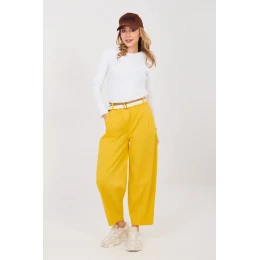 Pohodlné a štýlové nohavice v mrkvovom strihu, ideálne na každodenné ležérne nosenie. Vyrobené z kvalitnej bavlny s prídavkom elastanu, ktorý zaručuje pohodlie a jednoduchosť nosenia a jemnú elasticitu. Nohavice majú vysoký pás a nohavice sú stiahnuté a siahajú do dĺžky 7/8, čo im dodáva moderný charakter. V páse je všitý elastický pás a nohavice majú aj opasok so zapínaním na patentku, čo umožňuje ideálne prispôsobenie. Praktické bočné vrecká dodávajú nohaviciam funkčnosť a jednofarebný vzor uľahčuje ich kombinovanie s rôznymi kúskami šatníka. Tieto nohavice sú skvelou voľbou pre tých, ktorí ocenia pohodlie, voľnosť pohybu a moderný ležérny vzhľad.