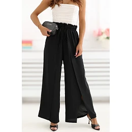 Kalhoty typu wide leg jsou skvělou volbou pro ženy, které si cení pohodlí a moderního stylu. Model s širokými, dlouhými nohavicemi se krásně pohybuje, dodává siluetě lehkost a volný charakter. Hladký vzor činí kalhoty univerzálními a snadno kombinovatelnými, skvěle ladí jak s jednoduchými tričky, tak s elegantnějšími blůzami. Nohavice s rozparkem dodávají celku jemnou lehkost a módní akcent. Šněrování v pasu a jemné zhuštění zajišťují pohodlné přizpůsobení a zdůrazňují pas, zároveň dodávají kalhotám zajímavější tvar. Chybějící kapsy zdůrazňují minimalistický charakter modelu. Vyrobené z měkké a elastické směsi viskózy a elastanu, kalhoty zaručují pohodlí po celý den. Stylová a pohodlná volba ideální na každodenní stylizace. Poznámka: Velikost na štítku M/L, avšak model je menší - odpovídá velikosti S/M (menší).