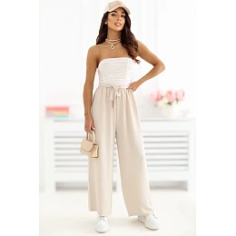 Kalhoty typu wide leg jsou stylovým a pohodlným návrhem na každý den. Model s širokými nohavicemi délky 7/8 dodává postavě lehkost a moderní charakter, skvěle se hodí do každodenních stylizací. Hladký vzor zdůrazňuje univerzálnost kalhot, díky čemuž je snadné je sladit s různými kousky oblečení, od jednoduchých topů po elegantní košile. Vysoký pas krásně zdůrazňuje pas, a šněrování v pase a dodatečný pás umožňují dokonalé přizpůsobení a dodávají celku ženský šarm. Kalhoty jsou vyrobeny z příjemné směsi viskózy a elastanu, což zajišťuje pohodlí nošení, elasticitu a dobrou úpravu na postavě. Absence kapes zdůrazňuje minimalistický a elegantní charakter modelu. Je to skvělá volba pro ženy, které oceňují kombinaci pohodlí s módním a nadčasovým stylem.