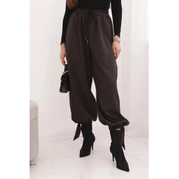 Dámske nohavice so širokými nohavicami a viazaním v spodnej časti hnedej farby