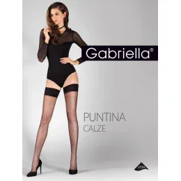 Tenké priesvitné pančuchy, vzorované, s prídavkom vlákna typu lycra. Zakončené čipkou so silikónom. 85% polyamid, 15% elastan.