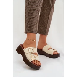 Dámské nazouváky vyrobené z textilního materiálu jsou stylovým a pohodlným návrhem na každý den. Model má dva pásky se zlatými přezkami, které zvýrazňují módní vzhled. Umístěny na platformě. Měkká vložka zvyšuje pohodlí i při delším nošení. Nazouváky jsou ideální pro letní stylizace, spojující funkčnost s elegantním vzhledem. Při výběru velikosti se řiďte tabulkou velikostí.