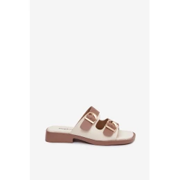 Dámské nazouváky vyrobené z eko kůže jsou klasickou volbou na každý den. Model má dva pásky se zlatými přezkami, které dodávají celku elegantní a stylový charakter. Plochá podrážka zajišťuje pohodlí při nošení a volnost při chůzi. Nazouváky se skvěle hodí do letních outfitů, vhodné jak k šatům, tak k casualovým setům. Při výběru velikosti se řiďte tabulkou velikostí.