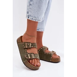 Dámské pantofle vyrobené z eko semiše jsou stylovým a pohodlným tipem na teplé dny. Korková platforma zajišťuje komfort nošení a přirozený letní charakter. Model je ozdoben zlatými přezkami a nýty, které dodávají celku módní a výrazný akcent. Pantofle se skvěle hodí do každodenních outfitů, vhodné jak k šatům, tak k casualovým sadám. Při výběru velikosti se řiďte tabulkou velikostí.