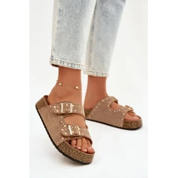 Dámské pantofle vyrobené z eko semiše jsou stylovým a pohodlným tipem na teplé dny. Korková platforma zajišťuje komfort nošení a přirozený letní charakter. Model je ozdoben zlatými přezkami a nýty, které dodávají celku módní a výrazný akcent. Pantofle se skvěle hodí do každodenních outfitů, vhodné jak k šatům, tak k casualovým sadám. Při výběru velikosti se řiďte tabulkou velikostí.