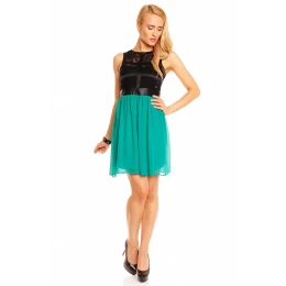 šaty, vhodné na večierok alebo párty. Tento model je bez rukávov a bez výstrihu. Vrchná časť týchto šiat vyzerá veľmi rafinovane. Vrchná časť je čipkovaná a obšitá pruhmi látky, pod čipkou je podšívka korzetového strihu. V zadnej časti je čipka len v oblasti lopatiek. V páse je koženka, ktorá rozdeľuje farebné časti šiat. Spodná časť sukne sa skladá z dvoch vrstiev. Dno má krásnu zelenú farbu, nie mätovú. Tieto šaty sa vzadu zapínajú na všitý zips, ktorý je veľmi nenápadný. Oblečte si tieto šaty na večierok, večer s priateľmi alebo na akúkoľvek inú príležitosť a budete mať ten najzaujímavejší model.Materiál, z ktorého sú šaty vyrobené, je pružný a príjemný na dotyk.kvalitné dámske šaty.