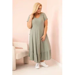 Dámske plus size šaty s krátkymi rukávmi a volánom z ľahkej viskózy v khaki farbe