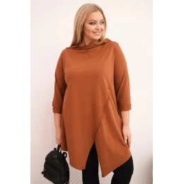 Dámske Plus veľkosť bavlnená blúzka asymetrické rukávy tmavé Camel