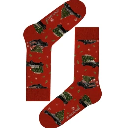 štýlové dámske vianočné ponožky John Frank v červenej farbe s veselým motívom retro autíčok prevážajúcich vianočné stromčeky. Pohodlný a mäkký materiál zaručuje príjemné nosenie počas celého dňa, či už doma, v práci alebo na zimných prechádzkach. Skvelý doplnok na sviatočné obdobie a ako pekný darček pre radosť.