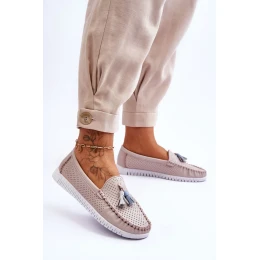 klasické dámske mokasíny sú vyrobené z prírodnej kože. Na prednej strane sú ozdobné strapce. Mokasíny boli postavené na platforme s gumovou protišmykovou podrážkou. Mäkká stielka z prírodnej kože je čiastočne perforovaná. Skvelý model pre mnohé jarno-letné štylizácie! Pri výbere veľkosti sa riaďte tabuľkou veľkostí.