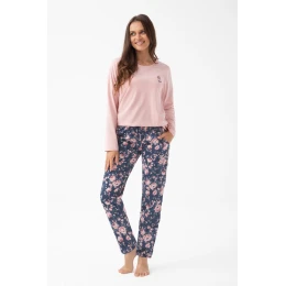 Dámske pyžamo Luna 318 J/25 BIG je jedinečnou kombináciou elegancie a pohodlia. Ružovú blúzku s dlhými rukávmi zdobí jemná výšivka ruží, ktorá dodáva ženský nádych, zatiaľ čo indigové dlhé nohavice s praktickými vreckami a potlačou ruží vytvárajú harmonický komplet ideálny na každé ročné obdobie. Celý komplet je vyrobený zo 100 % prírodnej bavlny, ktorá zaručuje mäkkosť, priedušnosť a pohodlie pri nosení počas celej noci.