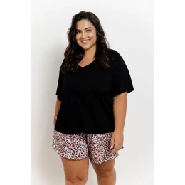 Dámske pyžamo s krátkymi rukávmi, hladkou blúzkou so srdiečkovým výstrihom a krátkymi šortkami s leopardím vzorom.