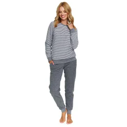 Dámske pyžamo 5247 tmavosivé Doctornap - vyrobené z kvalitnej a príjemnej hrubej bavlny - tmavosivé tričko s dlhými rukávmi - zdobené prúžkami - dlhé svetlosivé nohavice s vreckami - materiálové zloženie vrchnej časti: 80% bavlna + 20% polyester, spodná časť: 100% bavlna - certifikát OEKO-TEX Standard 100