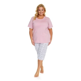 Dámske pyžamo 5365 Doctornap - vyrobené z kvalitnej bavlny - svetlofialové tričko s krátkymi rukávmi - vzorované kapri nohavice s vreckami - ukončené bielym lemovaním - certifikát OEKO-TEX Standard 100