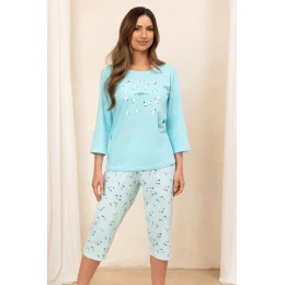 Dámska pyžamová súprava 707 BIG J/25 je očarujúca súprava z mäkkej 100 % bavlny, ktorá spája pohodlie so ženským štýlom. Jednoduché tričko s 3/4 rukávmi zdobí na prednej strane jemná kvetinová potlač, ktorá dodáva celej súprave jemný a ľahký vzhľad. Spodnú časť súpravy tvoria nohavice v 3/4 dĺžke zdobené celoplošnou kvetinovou potlačou - ideálne na teplejšie večery a noci. Súprava je zabalená v plastovom vrecku - pripravená na darovanie.
