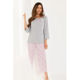 Dámske pyžamo 711 BIG J/25 je pohodlná a štýlová súprava určená pre ženy, ktoré ocenia pohodlie a jemný dizajn. Je celé vyrobené z kvalitnej bavlny, ktorá zaručuje priedušnosť a mäkkosť pri každom pohybe. Tričko s 3/4 rukávmi, polkruhovým výstrihom a kvetinovou potlačou na prednej strane pôsobí žensky a elegantne. Celú súpravu dopĺňajú vzorované nohavice s 3/4 dĺžkou - ideálne na jar a leto.