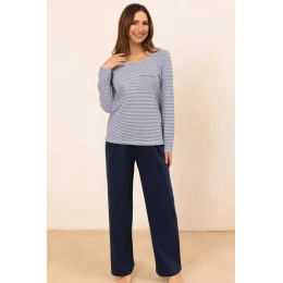 Dámska pyžamová súprava 715 J/25 je klasická súprava nočného oblečenia z vysokokvalitnej 100 % bavlny. Nadčasová pruhovaná košeľa s dlhými rukávmi a okrúhlym výstrihom zaručuje pohodlie a jednoduché nosenie. Dodatočné vrecko vo výške hrudníka jej dodáva šarm a funkčnosť. K súprave patria dlhé jednotné nohavice s elastickým pásom lemovaným bavlnou, ktorý zaručuje pohodlné nosenie bez tlaku. Vďaka prírodnému materiálu je súprava ideálna na večerné spanie a relaxáciu doma.