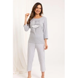 Dámske pyžamo 716 J/25 je štýlové a pohodlné, vyrobené z najkvalitnejšej 100 % bavlny. Tričko s 3/4 rukávmi a polkruhovým výstrihom zdobí na prednej strane jemná potlač, ktorá celku dodáva ľahký a ženský šarm. Súpravu dokonale dopĺňajú vzorované nohavice v dĺžke 7/8. Prírodný materiál zaručuje vzdušnosť, mäkkosť a pohodlie pri nosení počas celého roka - na spanie aj na domáci relax.