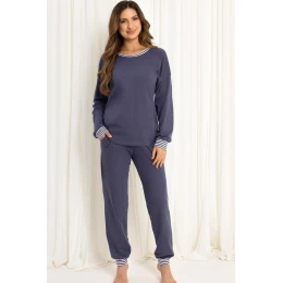 Dámske pyžamo 718 BIG J/25 je štýlová súprava domáceho oblečenia z mäkkého melanžového bavlneného úpletu. Je ideálna ako pohodlné pyžamo na noc, ako aj praktické domáce oblečenie na každý deň. Tričko s dlhými rukávmi a polkruhovým výstrihom je zakončené elastickým rebrovaním vo výstrihu a manžetách, ktoré sa dokonale prispôsobí. Dlhé nohavice s vreckami a pohodlným elastickým pásom zaručujú voľnosť pohybu a pohodlné nosenie. Celá súprava je vyrobená z prírodnej, priedušnej bavlny.