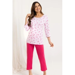 Dámske pyžamo 720 BIG J/25 je pohodlná a štýlová súprava vyrobená z vysokokvalitnej 100 % bavlny. Vzorované tričko s 3/4 rukávmi a polkruhovým výstrihom dodáva celej súprave energiu a jemný šarm. 7/8 dlhé nohavice v jednofarebnom prevedení dokonale vyvažujú vzor vrchného dielu a vytvárajú harmonickú a praktickú súpravu ideálnu na teplejšie noci alebo relaxáciu doma. Prírodná bavlna zaručuje priedušnosť a pohodlie počas celej noci.
