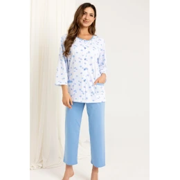 Dámske pyžamo 723 J/25 je kombináciou pohodlia, ženského štýlu a funkčnosti. Je vyrobené z kvalitnej 100 % bavlny, je príjemné na dotyk, priedušné a ideálne na všetky ročné obdobia. Vrchnú časť súpravy tvorí košeľa so 7/8 rukávom, zapínaná na gombíky, zdobená kvetinovou potlačou a vybavená praktickými vreckami na bokoch.