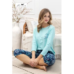 Dámske pyžamo Leveza Asteria 1651 je jedinečnou kombináciou pohodlia a ženského štýlu. Je vyrobené výhradne z prírodnej, priedušnej bavlny a poskytuje pohodlie pri spánku a každodennom relaxe. Papierovo zelená blúzka s okrúhlym výstrihom, 7/8 rukávmi a jemnou kvetinovou potlačou podčiarkuje jemný, ženský charakter. 3/4 dlhé nohavice s rybím chvostom v tmavomodrej farbe sú zdobené kvetinovým vzorom a saténovou mašľou v páse, čo im dodáva eleganciu a šarm. Pyžamo je dostupné vo veľkostiach M-2XL a je ideálnou voľbou ako pohodlná a štýlová voľba na každý večer.