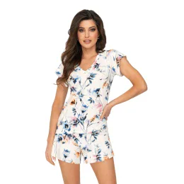 Astrid 1/2 krémové dámske pyžamo Donna - vyrobené z kvalitnej viskózy - krémové tričko s krátkymi rukávmi - výstrih do V - šortky s volánom - s kvetinovým vzorom