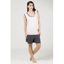 Letné dámske pyžamo ušité z veľmi príjemného materiálu vám dopraje ten najvyšší komfort aj v tých najparnejších nociach. Pyžamo sa skladá z dvoch dielov, tmavo šedých šortiek (s ozdobnou aplikáciou v páse) s dĺžkou do polovice stehien a tielka s hlbokým oválnym výstrihom. Tielko zdobí v dekolte umiestnená jemná mašle a na boku umiestnený tlač dvoch sŕdc. Horný diel je vyvedený v pastelovo ružovej farbe a oblasť okolo pása a výstrihu je olemovaná rovnakú šedú, akú nájdete aj na šortkách.