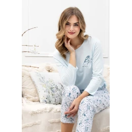 Dámske pyžamo BOGUSIA 1639 značky Leveza je ideálnou voľbou na pokojné noci a balzamové rána. Je vyrobené zo 100 % mäkkej a priedušnej bavlny a zaručuje pohodlie počas celého roka. Vrchná časť pyžama má blúzku s okrúhlym výstrihom, rukávy s dĺžkou 7/8 a pôvabnú potlač vtákov. Praktické vrecko poskytuje dodatočnú funkčnosť, zatiaľ čo pastelový odtieň detskej modrej dodáva ľahkosť a ženskosť. Súpravu dopĺňajú 7/8 nohavice v bielej a tmavomodrej farbe s motívom vtákov a ozdobnou mašľou v páse. K dispozícii vo veľkostiach M-2XL.