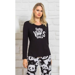 Dámske bavlnené dlhé pyžamo Good vibes. Pyžamo sa skladá z trička s dlhým rukávom a dlhých nohavíc. Na tričku je veľký nápis "Good Vibes only", ktorý dopĺňa obrázok malej rozkošnej pandy. Motív pandy sa opakuje na nohaviciach, ktoré majú elastický pás a šnúrku na stiahnutie. Pyžamové nohavice nemajú vrecká. Použitý bavlnený materiál je príjemný a pružný na dotyk.