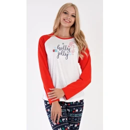 Dámske bavlnené pyžamo dlhé vianočný darček. Pyžamo sa skladá z trička s dlhým rukávom a dlhých nohavíc. Tričko zdobí nápis HOLLY JOLLY a obrázky vianočných darčekov. Nohavice sú potlačené vianočnými motívmi. Nohavice majú elastický pás, šnúrku na stiahnutie a sú ukončené lemami. Použitý materiál je pružný a mäkký na dotyk. Nohavice a tričko sa skladajú zo 100 % bavlny.