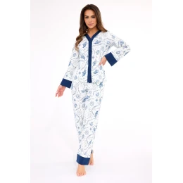 Dámske pyžamo AMBER DR 514/443 je štýlová a pohodlná súprava ideálna na všetky ročné obdobia. Je vyrobené zo 100 % mäkkej, priedušnej bavlny a poskytuje pohodlie pri spánku a domácom relaxe. Blúzka s dlhými rukávmi bez zapínania zo vzorovanej tkaniny pôsobí žensky a elegantne. K súprave patria dlhé nohavice s rovnými nohavicami a praktickými vreckami, ktoré zaručujú úplnú voľnosť pohybu.