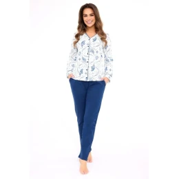 Dámske pyžamo KRISTIN DR 682/445 je ideálnou voľbou pre ženy, ktoré si cenia štýl, pohodlie a funkčnosť. Blúzka s dlhými rukávmi je vyrobená z kvalitnej vzorovanej bavlny a zapína sa na gombíky - je praktická a elegantná. Súpravu dopĺňajú pevné dlhé nohavice s rovnými nohavicami a vreckami, ktoré prispievajú ku každodennému pohodliu. Celá súprava je vyrobená z prírodnej tkaniny, ktorá zabezpečuje tepelný komfort, priedušnosť a voľnosť pohybu. Pyžamo je zabalené v estetickej škatuľke, vďaka čomu je aj skvelým nápadom na darček.