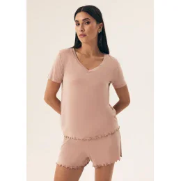 Dámske pyžamo od značky Henderson je skvelou voľbou na pohodlný spánok a domáce leňošenie. Pyžamo sa skladá z trička s krátkymi rukávmi a výstrihom do V a šortiek, ktoré majú široký elastický pás pre maximálne pohodlie. Spodný okraj trička a nohavice šortiek zdobí jemné zvlnenie, ktoré celému kompletu dodáva ženský a elegantný vzhľad. Vďaka mäkkému materiálu je pyžamo mäkké a príjemné na nosenie.