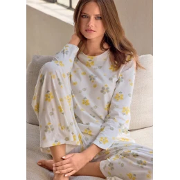 Dámske pyžamo Infiore v jemnom krémovom odtieni s drobnou kvetinovou potlačou pôsobí ľahko a veľmi žensky. Vrchný diel s dlhými rukávmi má jednoduchý okrúhly výstrih a pohodlný voľný strih, ktorý je ideálny na spánok a relaxáciu doma. Nohavice s rovnými nohavicami krásne splývajú a zaisťujú maximálne pohodlie pri nosení. Príjemný mäkký materiál je hebký na dotyk a vhodný na celoročné použitie. Pohodlné a štýlové pyžamo ideálne pre ženy, ktoré uprednostňujú jemný dizajn a pohodlie.