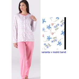 Dámske pyžamo talianskej značky Karelpiu. Pyžamo sa skladá z trička a nohavíc. Tričko má dlhé rukávy, okrúhly výstrih s légou a gombíky po celej dĺžke - dá sa rozopnúť. Tričko má celoplošnú kvetinovú potlač. Na spodnej časti bokov sú našité vrecká. Nohavice sú dlhé, jednofarebné, bez vreciek. V páse je pohodlný elastický pás. Pyžamo je vyrobené z ľahkej a príjemnej bavlny. Pyžamo je dostupné v dvoch farebných variantoch. Materiálové zloženie: 100 % bavlna.