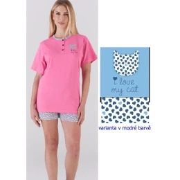 Dámske letné pyžamo od talianskej značky Karelpiu. Pyžamo je dvojdielne. Tričko má krátke rukávy, okrúhly výstrih s légou a tri gombíky. Tričko je jednofarebné a na pravej strane má našitý obrys mačacej hlavy, pod ktorým je vytlačený nápis. Šortky sú celopotlačené srdiečkami, nemajú vrecká a v páse je všitá pohodlná guma. Pyžamo je vyrobené z ľahkej, príjemnej bavlny, ktorá je ideálna na letné dni. Pyžamo sa dodáva v dvoch farebných variantoch. Materiálové zloženie: 100 % bavlna.