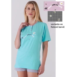Dámske pyžamo od talianskej značky Karelpiu. Pyžamo sa skladá z dvoch častí. Tričko má krátke rukávy, okrúhly výstrih okolo krku a potom pokračuje pásikom s tromi gombíkmi. Na prednej strane je potlačená aplikácia. Šortky sú farebné, v páse sú všité do pohodlnej gumy. Pyžamo je vyrobené z ľahkej príjemnej bavlny, ideálnej na letné dni. Pyžamo sa dodáva v dvoch farebných variantoch.
