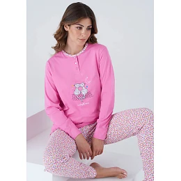 Dámske bavlnené pyžamo značky Karelpiu. Pyžamo pozostáva z trička s dlhými rukávmi, okrúhlym výstrihom a zapínaním na tri gombíky okolo krku. Rukávy sú zakončené lemom z rovnakého materiálu ako tričko. Nohavice majú elastický pás. Pyžamo je vyrobené z príjemnej bavlny.