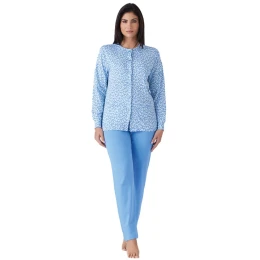 Dámske bavlnené pyžamo značky Karelpiu. Pyžamo pozostáva z bundy s dlhými rukávmi a zapínaním na gombíky po celej dĺžke. Rukávy sú ukončené voľne. Nohavice majú elastický pás. Pyžamo je vyrobené z príjemnej, hrejivej bavlny.