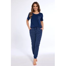 Dámske pyžamo Jenny KR 730/317 spája pohodlie so štýlovým dizajnom a je ideálne na všetky ročné obdobia. Košeľa s krátkymi rukávmi je vyrobená zo 100 % bavlny, je mäkká, priedušná a príjemná na pokožku, s našitým náprsným vreckom pre jemný pôvab. Dlhé pruhované nohavice, vyrobené z 92 % bavlny a 8 % polyesteru, zaručujú pohodlie a voľnosť pohybu. Elastický pás a nastaviteľná šnúrka umožňujú dokonalé prispôsobenie, zatiaľ čo vrecká na bokoch dodávajú funkčnosť
