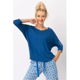 KEY LNS 721 je dámsky pyžamový top, ktorý spája pohodlie s moderným štýlom. Intenzívna tmavomodrá blúzka má voľný oversize strih s 3/4 rukávmi a výstrihom do V. Jemná potlač na rukáve dodáva decentný nádych. Svetlomodré nohavice s kvetinovou potlačou krásne kontrastujú s topom a dodávajú pyžamu ľahkosť. Elastický pás so zaväzovaním zaručuje dokonalé prispôsobenie a celonočné pohodlie. Vyrobené z mäkkej, priedušnej tkaniny - ideálne na relaxačné večery aj pohodlný spánok.
