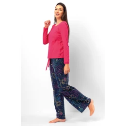 Toto dámske pyžamo je dokonalou kombináciou pohodlia, funkčnosti a energického dizajnu. Vrchný diel v intenzívnej ružovej farbe má dlhé rukávy, jemné zdobenie na manžetách a jemnú potlač na prednej strane, ktorá mu dodáva šarm. Nohavice z mäkkej, na dotyk príjemnej tmavomodrej tkaniny zdobí nápaditý, farebný vzor pripomínajúci hviezdnu oblohu alebo abstraktné špirály. Voľný strih a elastický pás zaručujú úplnú voľnosť pohybu a pohodlie počas spánku. Je to ideálna voľba pre ženy, ktoré sa chcú doma cítiť štýlovo a pohodlne.