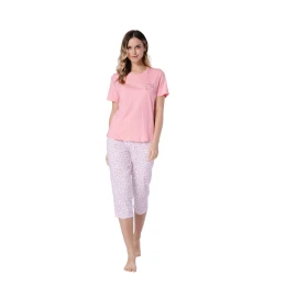 Nohavice s dĺžkou 3/4 boli navrhnuté pre maximálne pohodlie. Biela a koralová farba a jemný kvetinový vzor dodávajú pyžamu ľahkosť a jemnú eleganciu. Model nemá vrecká, vďaka čomu dokonale prilieha k telu a neobmedzuje v pohybe.