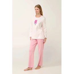 Vychutnajte si príjemné zimné večery s týmto dámskym pyžamovým setom zo 100 % bavlny interlock. Set obsahuje hladké nohavice a bodkovaný top s roztomilou potlačou a klasickým okrúhlym výstrihom. Je navrhnutý v regular fit strihu, ktorý ponúka pohodlie a lichotivú siluetu. Tento pyžamový set je ideálny na relaxáciu doma alebo na dobrý spánok a spája v sebe štýl a pohodlie.